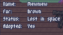 its sooo cute but i suggest something what if theres a chance a cat likes another cat which means the cat will play often with the cat he/she likes and if they both like eachother they will be automatically adopted and will find 15-20 coins together and no need to buy a collar for them just a suggestion but love it!